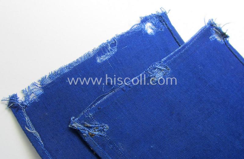 This is an attractive, linnen-based- and/or bright-blue- (ie. 'kornblumenblauer'-) coloured armband (ie. 'Armbinde') depicting a neat - unusually seen! - felt-woolen-based- and beige-white-coloured capital 'M'-character as was presumably intended for staff-members (ie. 'Melder') of the German RLB (ie. 'Reichsluftschutz-Bund') and that comes in an overall nice- (albeit clearly issued- and/or most certainly worn-), condition. These neat linnen-based armbands were (presumably) used by the various (civil- and/or military-) staff-members of the German air-raid-warden service (ie. 'RLB') and signified: 'Melder'. The armband on offer here measures approximately 41 x 9,3 cms. and is executed in typical, fine-structured linnen (showing a white-beige-coloured- and felt-woolen-based capital 'M'-character as can be seen on the pictures). The piece - that is not stitched-together as more often - shows some minimal staining ie. dust simply caused by moderate wear and/or decades of storage (as can be seen on the pictures). This example originates from a larger-sized armband-collection that was compiled over the years and that I recently acquired for the web-site. I deem that I have priced this interesting RLB- (ie. 'Reichsluftschutz-Bund'-) related example accordingly!