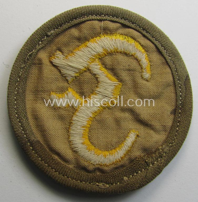 This is an attractive example of a 'tropical'-issue, WH (Heeres) special-career arm-insignia (or: 'Laufbahn- o. Tätigkeitsabzeichen') as was specifically intended for usage by an army: 'Feuerwerker' (or: artician ie. exposives orderly) and that comes in an overall very nice- (I deem simply never worn- nor tunic-attached-), condition. The neat patch is executed in golden-yellow-coloured linnen on a (typical) mustard-brownish- (ie. tan-) coloured and/or: linnnen-based background and shows a (detailed, Gothic-styled- and/or neatly machine-embroidered) 'F'-character (as can be seen on the pictures). The piece is not maker-marked and shows some minimal staining (I deem simply caused by years of storage and/or handling only). This example is also nicely 'backed' with a piece of linnen-based cloth and shows a reinforced rim as is more often encountered. Simply a nice occasion to acquire a neat 'tropical'-issue- ie. DAK- (or 'Deutsches Afrikakorps'-) related 'Feuerwerker' speciality-patch!