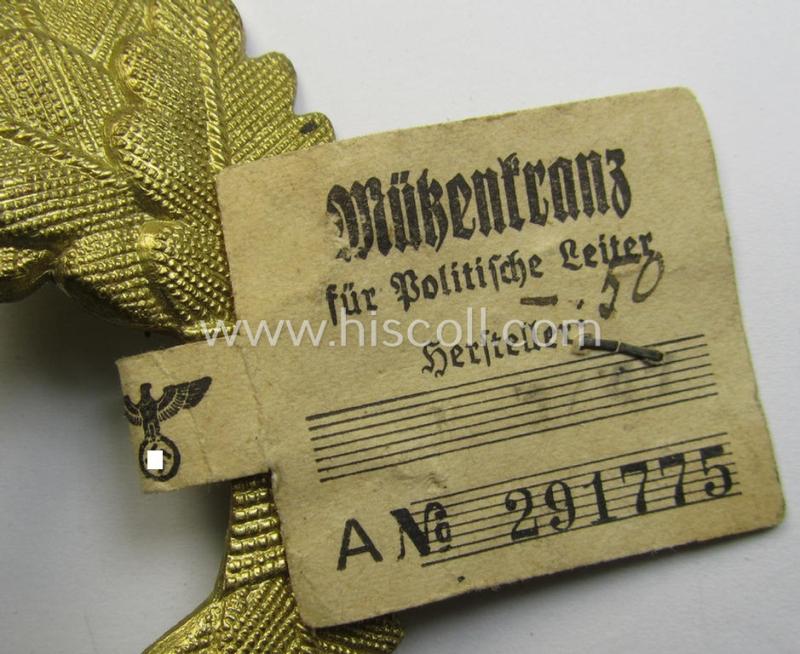 Matching (political-style) N.S.D.A.P.-visor- (ie. 'Schirmmützen'-) cap-insignia-set for a: 'politischen Leiter' (comprising of a cap-wreath and dito cap-cocarde, both pieces being neatly: 'RzM' and/or: 'M1/47'- (ie. 'M1/63'-) marked examples