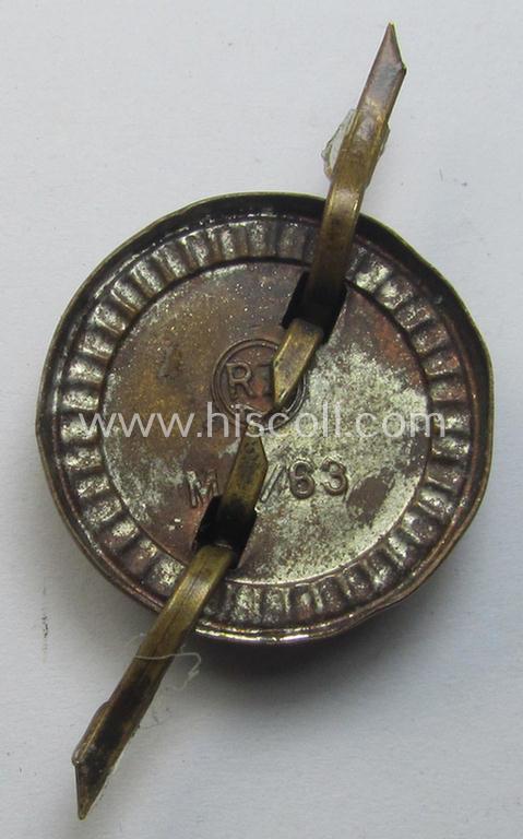 This is a very attractive - and truly detailed and matching! - (political-style) N.S.D.A.P.-visor- (ie. 'Schirmmützen'-) cap-insignia-set (comprising of a bright-golden-toned cap-wreath and dito cap-cocarde, both pieces being neatly: 'RzM'- (ie. 'M1/47'- and/or 'M1/63'-) marked on their backs and that come both in an overall very nice condition. Both insignia-pieces - as were intended for usage on the various political-style visor-caps (ie. 'Schirmmützen für politischen Leiter') were found together and make a truly nice set. The wreath was most certainly never cap-attached and retains all its functional prongs in place. The wreath (ie. 'Mützenkranz') is bright-golden-toned (ie. is: 'feuervergoldet') and shows the maker-designation: 'RzM' and/or: 'M1/47' on its back and still shows its (period-attached!) paper-based 'RzM'-etiket attached (as can be noticed on the pictures). The cocarde - which was presumably once cap-attached - bears the maker-designation: 'RzM' and/or: 'M1/63' on its back and is of a multi-piece construction and retains truly great pronounced detail and naturally also retains both its (period) pins ie. prongs (which were possibly once bent but which are of course still functional). Simply an attractive and detailed 'party-style' N.S.D.A.P.-visor-cap wreath/cocarde-set that is with certainty accordingly priced!