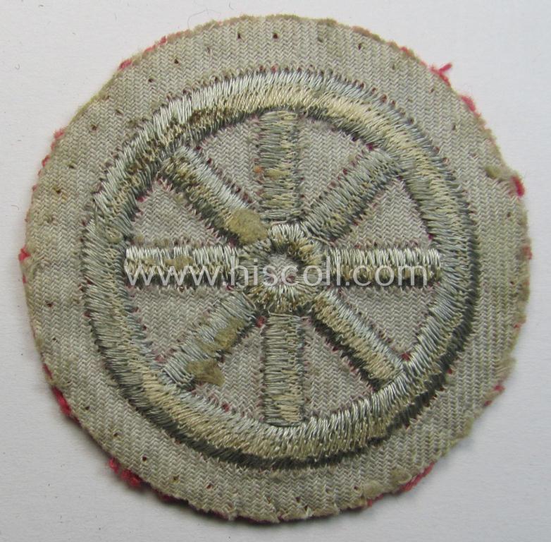 This is attractive - and truly used- ie. carefully tunic-removed! - example of a HJ ('Hitlerjugend') so-called: 'Motor-HJ Prüfungsabzeichen in Silber' (or: silver-class motor-proficiency badge) being a piece that comes without an 'RzM'-etiket and that comes in an overall nicely preserved condition. The neat - smaller-sized badge having an approximate diameter of 3,2 cms. - is sometimes referred to as: 'HJ-Ausbildungsabzeichen' (aka: trainings-badge) and just shows some minor staining caused by minimal wear and/or years of storage only. The patch is nicely 'backed' with beige-white-coloured linnen as is more often the case and still shows the (machine)stitching-holes with which it was once tunic- ie. shirt-attached (as can be seen on the pictures). This is the so-called: second- (ie. silver) class pattern badge, as was executed in silver-greyish-coloured linnen onto a bright-pink-coloured- and/or woolen-based background. Simply an attractive - and actually not that often encountered! - youth-related proficiency-badge that will be hard to be upgraded!