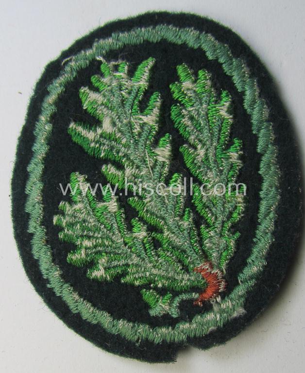 Attractive example of a WH (Heeres) so-called: 'Jäger'-armbadge being a neatly machine-embroidered- and/or multi-coloured version as was executed on darker-green-coloured wool