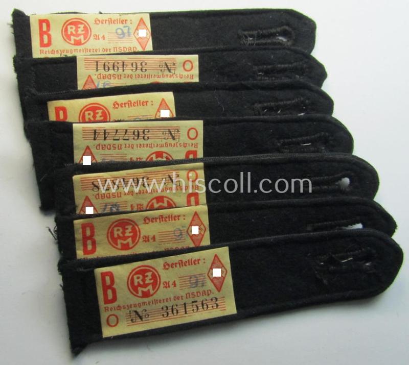 I recently uncovered a small stack holding 7 - fully identical and truly 'virtually mint- ie. unissued'! - examples of the: 'DJ- o. Deutsches Jungvolk' shoulderstrap as was specifically intended for usage by the: 'DJ-Mitglieder' serving within the: 'Bann 539' (539 = 'Vöcklabruck') and that all seven still show their period-attached, 'RzM'-etiket and that come all in a wonderful and fully untouched, condition. The seven straps are executed in black-coloured wool showing the white-embroidered '539'-numerals and having the black-coloured- (and/or rayon-based) piping attached. They come without tongue as found: the straps measures 11 cms. in length as is usually encountered and were most certainly intended to be worn as straps of the 'sew-in'-pattern. The pieces shows some minimal age and/or staining simply caused by decades of storage only. Of additional interest is, moreover, the fact that these examples still show their period-attached 'RzM'-etikets (as can be noticed on the pictures). My asking-price is naturally intended per single specimen. Simply a nice occasion to acquire an attractive so-called: 'DJ- o. Deutsches Jungvolk'-shoulderstrap that was intended for usage within the unusually encountered, Austrian 'DJ-Bann 'Vöcklabruck' as was based in the 'Gebiet 29 - Südost Oberdonau' for a competitive price!