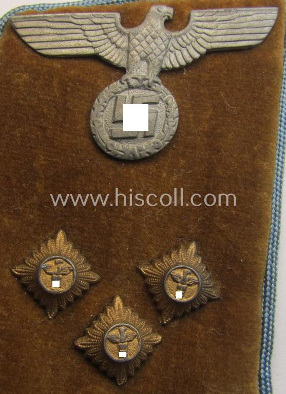 This is an attractive - albeit regrettably single! - N.S.D.A.P.-type collar-patch (ie. 'Kragenspiegel für politischen Leiter') being of the third- and final pattern as was used from 1939 upto 1945 being a piece as was specifically intended for usage by an: 'N.S.D.A.P.-Einsatzleiter' at 'Orts'-level and that comes in an overall nice- (albeit moderately used- ie. worn-), condition. The piece - which is constructed from the light-brown-coloured- and/or 'smooth-type'- (ie. typical 'velvet-type'-) wool - comes in a just moderately used- and/or worn condition overall: it shows a (single) and somewhat faded, golden-toned eagle-deviced and three (equally-styled) pips period-attached and was clearly once mounted onto a tunic or shirt. The tab is piped with typical light-blue- (ie. 'hellblauer'-) coloured- and/or rayon-based piping (as always) signifying that it was intended for a party-official serving at: 'Orts'-level (being the lowest level in existance). The tab is neatly backed with a piece of 'buckram'-based material but misses its 'RzM'-etiket: it does show, however, an inked numeral ('128') (as can be seen on the pictures) and does show obvious wear, age and/or staining. Simply an attractive - and actually quite usually encountered! - 'Politischen Leiter der N.S.D.A.P.'-collar-tab that is not that often offered for sale and that is I deem accordingly priced!