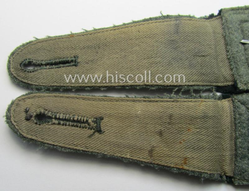 This is an attractive - fully matching and with certainty scarcely found - pair of WH (Heeres), early- (ie. pre-war-) period, 'M36 o. M40'-pattern- (ie. pointed-styled) 'cyphered' and/or (typically) non-piped shoulderstraps, as was specifically intended for usage by an: 'Oberfeldwebel des Infanterie-Regiments 12' (or: sergeant first-class who served within the infantry-regiment numbered: '12') and that comes in an overall nice- (I deem just moderately used ie. worn-), condition. The shoulderstraps - which measure both approximately 12,6 cms. in length - have the 'standard'-pattern- and/or darker-green-coloured, smooth-woolen-based 'upperdecks' and have (of course) no piping (as per regulation). The shoulderstraps show two (fully matching, smaller-sized-, silver-toned- and/or zinc- ie. 'Feinzink'-based) so-called: '1'- and/or '2'-numerals (ie. cyphers or 'Ziffern') and four (regular-sized and equally-styled) pips attached. The straps - which come mounted onto their functional tongues and that show the 'standard-issued'- (ie. 'dotted'-) pattern, silver-coloured NCO-braid attached - show as stated above moderate usage and/or wear (some minor staining and/or dust is visible and/or present). It should be noted that all 'cyphered', 'Infanterie'-related NCO-type shoulderstraps are quite desirable and can easily be regarded 'scarce'. Of additional interest is, moreover, the fact that the NCO who wore this pair carefully removed the surely once present (and by means of 'Kurbelstickerei'-stitched) '1'- and/or '2'-numerals and replaced these with metal specimen: the remains of the interwoven cyphers are still clearly visible and present. Simply an attractive, early- (ie. pre-war-) period, neatly 'cyphered, 'Heeres' shoulderstrap-pair that was specifically intended for usage by an: 'Oberfeldwebel des Infanterie-Regiments 12' that is (I deem) accordingly priced!