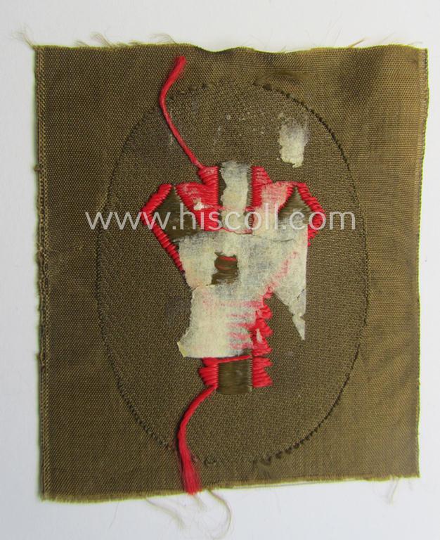 This is an attractive - and actually not that commonly encountered! - SA (ie. 'Sturmabteilungen') armbadge as executed in neat 'BeVo'-weave pattern, as was specifically intended for usage by a: 'Sanitäts-Unterführer o. Mann' (ie. 'SA-Feldscher' or: medical-orderly) and that comes in an overall very nice- (ie. simply never used- nor tunic- ie. shirt-attached-), condition. This nicely woven arm-badge is sized: 7 x 5 cms. (and is executed in bright-red-coloured linnen on a - typical SA-coloured - brownish-coloured and/or also linnen-based background). The piece was simply never folded nor trimmed but has lost its so-called: 'RzM'-etiket over the years: some paper-remains are, however, still present (as can be seen on the pictures). It just shows some minimal age ie. staining caused by decades of storage only. Simply a neat - and actually not that commonly encountered! - 'BeVo'-type, SA-related arm-patch that belonged to an: 'Sanitäts-Unterführer o. Mann' (ie. 'SA-Feldscher')!