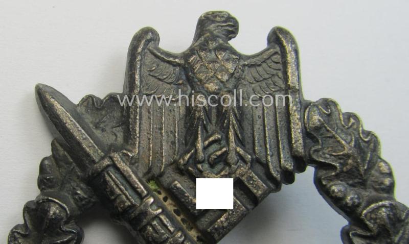 This is an attractive - albeit most certainly issued- and/or just moderately worn - example of an: 'Infanterie Sturmabzeichen in Silber' (or: silver-class infantry-assault-badge ie. IAB) being a non-maker-marked, so-called: 'solid-back- ie. copper-coated' example as was executed in darkened silver-toned, zinc- (ie. 'Feinzink'-) and that was - I deem - produced by the: 'E. Ferd. Wiedmann'-company and that comes in an overall very nice- (and I deem surely issued- and/or just moderately used ie. worn-), condition. This example is a typical non-maker-marked award and shows the various characteristics as only seen on IABs as produced by the: 'E. Ferd. Wiedmann'-company as was based in the town of Frankfurt a. Main. The - truly very pronounded! - war-badge seems to be totally uncleaned and has a still a very attractive and somewhat tarnished age-patina: truly most of its period-applied (and somewhat 'frosted' ie. darkened!) silver finish has been nicely preserved (as can be seen on the pictures). The pin and/or catch (ie. set-up-) are of course fully functional and present (as can be seen on the pictures). The piece - which originates from a private-household where it was recently found - was never cleaned and has been nicely preserved. Simply an honest 'Feinzink'-based, silver-class IAB of the 'solid-back- ie. copper-coated'-variant-type that was produced the desirable maker (ie. 'Hersteller'): 'E. Ferd. Wiedmann' and that is accordingly priced!