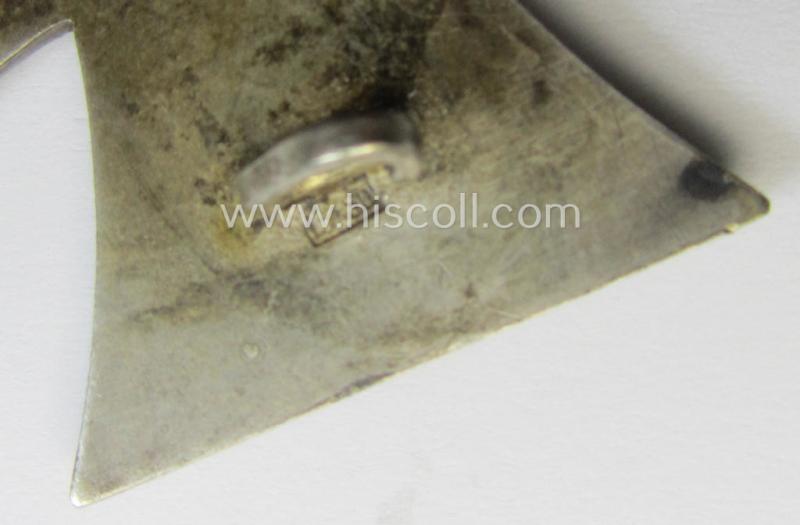 This is an attractive - albeit just moderately worn- ie. used - example of an: 'Eisernes Kreuz 1. Klasse' (or: Iron Cross 1st class) being an - I deem - fairly early-period- and/or clearly maker- (ie. 'L/50'-) marked example as was produced by the desirable maker (ie. 'Hersteller'): 'Gebrüder Godet' (ie. 'Hersteller L/50') and that comes as issued and/or recently found and that comes in an overall nice- (albeit moderately used- and/or clearly worn-), condition. The magnetic (and typically non-vaulted) cross has an attractive (somewhat darkened) age-patina and retains truly great detail: the black-coloured core shows some minimal staining and/or paintloss (mainly within the swastika-area as can be noticed on the pictures). The cross has lost its off-factory-applied polished sides (ie. 'hochpolierte Kanten'). The back of the cross is just minimally stained and dirty (but was never cleaned nor polished). The (straight-shaped) pin and typical catch (ie. set-up) are naturally unaltered and/or fully functional. The cross is I deem - as stated above - an early-period example that was produced by the maker 'Gebr. Godet' as based in the town of Berlin and that was never before in a collection. I deem that this attactive but clearly used example is accordingly priced!