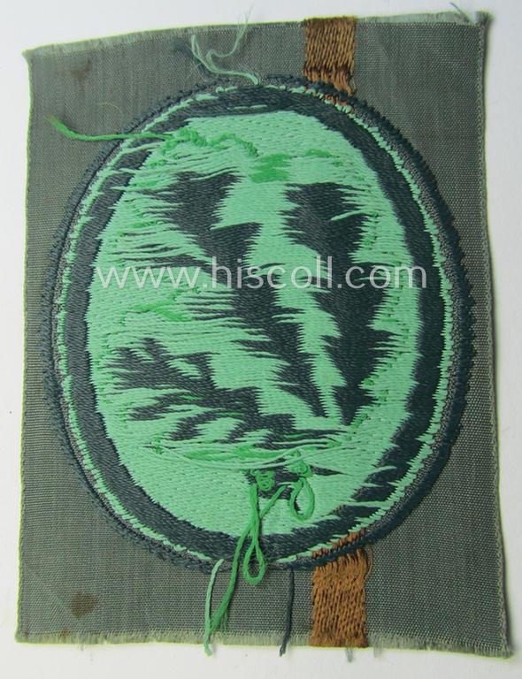 This is a neat example of a WH (Heeres) enlisted-mens'- (ie. NCO-) type, so-called: 'Jäger'-armpatch being a (typical) 'BeVo'-woven example as was executed on field-grey-coloured linnen as was intended for usage by the: 'Jäger-Truppen' and that comes in an overall very nice- (ie. simply never used- nor worn- ie. 'virtually mint-/unissued'-, condition. These attractive 'Jäger'-armpatches (as was intended for usage by the: 'Jäger-Truppen'- or: rifle-troops throughout the war) are showing three oakleaves on a darker-green-coloured background and were worn on the right upper-sleeve by the troops that were attached to the various 'Jäger'- (ie. rifle-) regiments (being some sort of mid-war-period, mountain-troop-related, infantry-units). The piece on offer here came 'as straightly cut-of the role' and will be hard to be upgraded: it is just a tiny bit wrinkled. Simply a nice occasion to acquire a neat (and of course genuine!) Heeres-'Jäger'-armpatch for an interesting price!