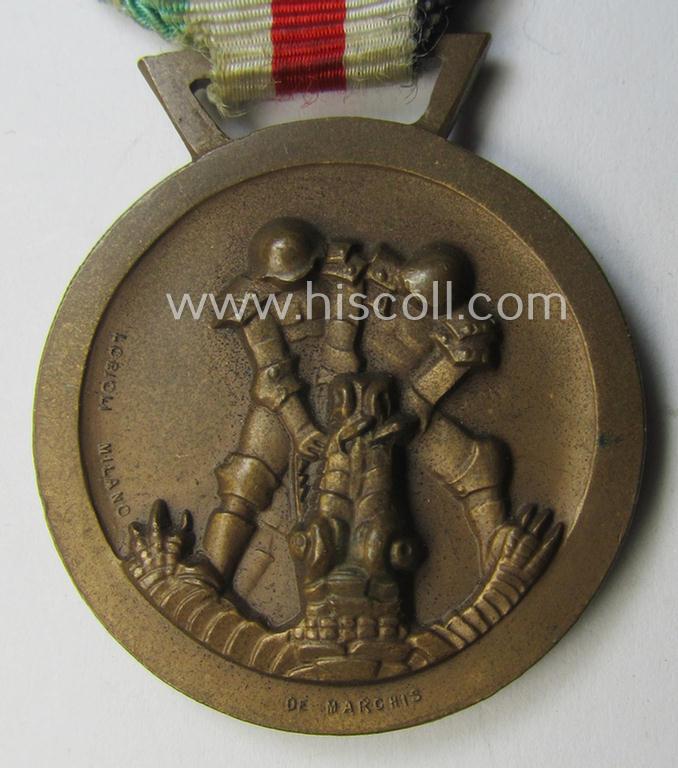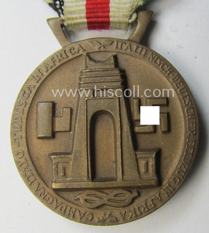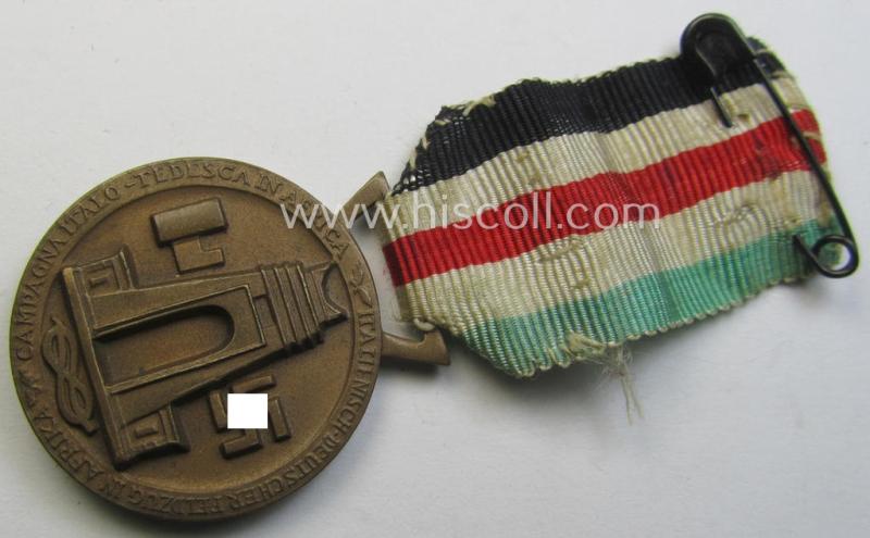 Attractive, golden-bronze-coloured- (and I deem 'Buntmetall'-based-) example of a: 'Deutsch-Italienische Feldzugsmedaille' (or: German-Italian campaign-medal) that comes mounted onto its (regular-sized) piece of original (an minimally faded) ribbon