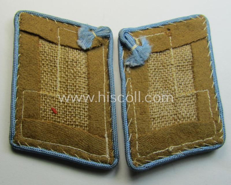 This is an attractive - fully matching and actually scarcely encountered! - pair of N.S.D.A.P.-type, smooth-woolen-based collar-patches (ie. 'Kragenspiegelsatz für politischen Leiter') being of the second pattern as was used from 1934 upto 1939 as was specifically intended for usage by an: 'N.S.D.A.P.-Hauptstellenleiter' at 'Orts'-level and that comes in an overall very nice- (ie. 'virtually mint- ie. unissued'- and/or never tunic-attachd), condition. The neat pieces - which are constructed from the golden-brown-coloured- and/or typical 'smooth-type'- (ie. moleskin-type-) wool - come in a wonderful condition overall: they both have the neat, double silver-coloured (and L-shaped) swastika-braid attached and were simply never mounted on a tunic. The tabs are piped with light-blue coloured- and rayon-based piping (as always) signifying that the pair was intended for a party-official serving at: 'Orts'-level. Both tabs are void of a paper-based 'RzM'-etiket as issued. The set was most certainly never worn and originates from a fairly large cloth-insignia lot that originated from an older collection in the USA. The set shows some (truly non-disturbing) tarnish and/or aging caused by having been stored as such for decades (as can be noticed on the pictures). In any case is this a neat and fairly unusually encountered N.S.D.A.P.-collar-tab-set that is not that often offered for sale. Only the third such neat N.S.D.A.P.-related collar-tab-set in this particular rank I ever had on offer!
