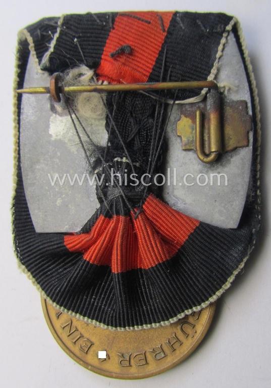 This is a neat example of a bright-golden-toned (and somewhat 'broad-shaped!), WH (Heeres o. Kriegsmarine etc.) so-called: 'Einzelspange' (or: single-pieced medal-bar) being of the 'standard-issued'- ie. 'non-detachable'-pattern and showing a WH Czech 'Anschluss'- (ie. occupation-) medal: '1 October 1938' (as was given to all members of the armed forces that participated in the German occupation of Czecoslovakia, which started on 1 October 1938) and that comes mounted onto its confectioned, black/red/black-coloured ribbon (ie. bar) as issued and/or minimally worn. The detail on this example is nicely preserved: it has never been cleaned nor polished and has an attractive and somewhat 'frosted'- (ie. minimally tarnished- ie. stained) age-patina (as can be seen on the pictures). The medal comes 'mounted' onto a metal-based 'clasp' that shows a functional pin- ie. pin/catch-set-up as was intended for wearing this example on a 'going-out'- ie. dress-tunic or 'Waffenrock'. Hard to find a more attractive WH Czech 'Anschluss'-medal that comes mounted as an: 'Einzelspange'!