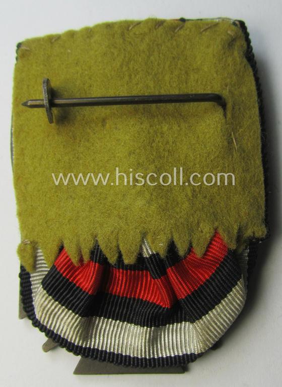 This is an attractive example of an - actually unusally seen! - golden-bronze-toned, so-called: 'Einzelspange' showing a WWI-period: 'Frontkämpferkreuz 1914-18 mit Schwertern' (ie.: 'Kriegsteilnehmerkreuz 1914-18 mit Schwertern') that has (I deem) been hardly used- nor worn. The piece is a detailed- and/or zinc- ie. 'Feinzink'-based, specimen that is neatly maker-marked on its back: it bears the makers'-designation: 'G.S.' (as can be seen on the pictures). The detail on this example is extraordinary: it has never been cleaned nor polished and has an attractive and somewhat 'darkened'- (ie. tarnished) age-patina. The medal is 'mounted' onto a chromed-steel-based clasp that its 'backed' with yellowish-coloured wool (with functional pin/catch) as was intended for wearing this example on a 'going-out'- ie. dress-tunic or 'Waffenrock'. This example retains pronounced details and has a great ie. only minimally darkened- ie. tarnished age-patina: it truly retains all of its bronze-toned finish (as can be seen on the pictures). The multi-coloured ribbon shows only minimal usage and/or staining. It should be mentioned that it is actually quite unusual to find a: 'Frontkämpferkreuz 1914-18 mit Schwertern' mounted as an: 'Einzelspange'!