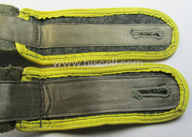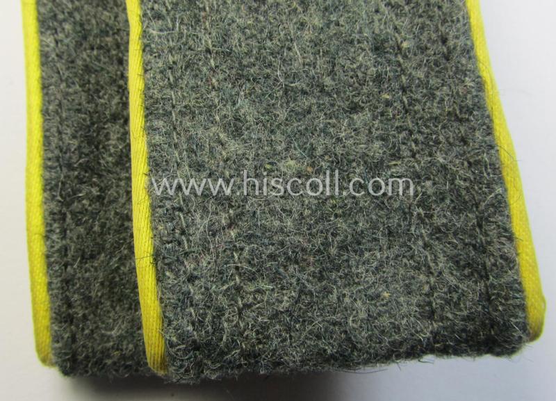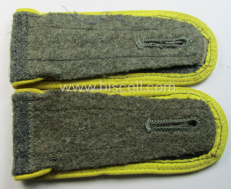 This is a very attractive - fully matching and I deem hardly used! - pair of (typical) later-war-period, WH (Heeres) so-called: 'M44'-styled, 'simplified', enlisted-mens'-type shoulderstraps as was piped in the neat bright-yellow- (ie. 'zitronengelber'-) coloured branchcolour as was intended for - and minimally used by! - a: 'Soldat der Nachrichten-Truppen' (or: simple soldier who served within a later-war-period, army signals'-regiment) and that comes in an overall very nice- (ie. hardly used- ie. 'virtually mint'-), condition. The straps - which are approximately 11 cms. sized in length each as more often - have the 'standard-pattern'- and/or typical, field-grey-coloured and/or woolen-based 'upperdecks' (which are executed in so-called: Italian wool aka 'drap Orti') and/or typical tongues and do show the bright-yellow- (ie. 'zitronengelber'-) coloured and/or: 'silk-like'-type branchcolour (ie. piping) attached. The straps are constructed following the typical '1944 cloth-minimising production-manner' using different shades of wool and/or material (as can be seen on the pictures). The straps show some minimal age, wear and/or staining simply caused by minimal wear and/or decades of storage. It should be noted that all 'M44'-style, EM-pattern shoulderstraps are actually quite hard to encounter and can easily be graded 'scarce': even more so when they come in such a nice and minimally used- and/or worn condition. Simply a nice occasion to acquire an attractive - and fully 'text-book'! - M44-styled, enlisted-mens'-type shoulderstrap-pair as was intended for usage by a: 'Soldat der Nachrichten-Truppen': great to complete any later-war M44- (ie. even M43-) model 'Heeres'-tunic!