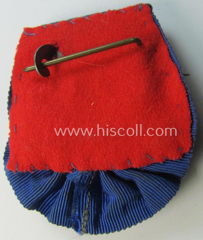 This is an attractive - and I deem just moderately used- and/or worn! - example of a minimally tarnished, (bright) silver-toned WH (Heeres o. Kriegsmarine) so-called: 'Einzelspange' (or: single-pieced medal-bar) showing a detailed: 'WH-Dienstauszeichnung 4. Stufe' (as was intended for 4 years of loyal-service) and that has a neat and pronounced (regular-sized) WH (Heeres o. Kriegsmarine) eagle-device period-attached and that comes mounted onto its confectioned, darker-blue- (ie. cornflower-blue-) coloured ribbon as issued and/or worn. The detail on this example is simply extraordinary: it has - I deem - never been cleaned nor polished and has an attractive and as stated above minimally tarnished) age-patina. The medal comes 'mounted' onto a metal-based clasp that is 'backed' with a piece of bright-red- coloured wool (and having a functional pin/catch-set-up) as was intended for wearing this example on a 'going-out'- ie. dress-tunic or 'Waffenrock'. This example truly retains gorgeous details and has a great age-patina: it retains most of its somewhat 'matted'- and/or: silver-toned finish without showing any defaults. The blue-coloured ribbon shows only minimal usage and/or staining. Simply an attractive WH (Heeres o. Kriegsmarine) example that comes mounted as an: 'Einzelspange'!