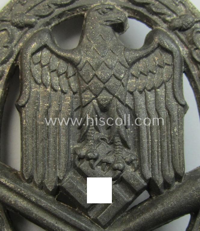 Attractive, 'Allgemeines Sturmabzeichen' (or: General Assault Badge ie. GAB) being a non-maker-marked, zinc- (ie. 'Feinzink'-) based: 'flat-back-variant' as was (presumably) produced by the maker (ie. 'Hersteller'): 'Hermann Wernstein'