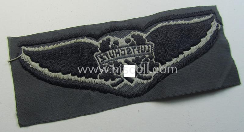This is an attractive - and actually scarcely encountered! - enlisted-mens'- (ie. NCO-) pattern, so-called: 'Luftschutz' (ie. RLB-) (side)cap-badge (ie. 'Mützenabzeichen') being a detailed example as executed in so-called: 'BeVo'-weave-pattern onto a greyish-blue-coloured background and that comes in a 'virtually mint- ie. unissued'- and/or never cap-attached-, condition. These attractive cap-badges were worn on the various (Luftwaffe-type) blue-coloured side(caps) throughout the war. The nicely detailed patch on offer here - which measures from wingtip to wingtip approximately 9,5 cms. - simply shows no wear nor damage whatsoever and comes as straightly 'cut-of the role' and was naturally never folded nor confectioned (as can be seen on the pictures). Simply a great opportunity to acquire a neat enlisted-mens'- (ie. NCO-) pattern, so-called: 'Luftschutz' (ie. RLB-) cap-badge for a competitive price!