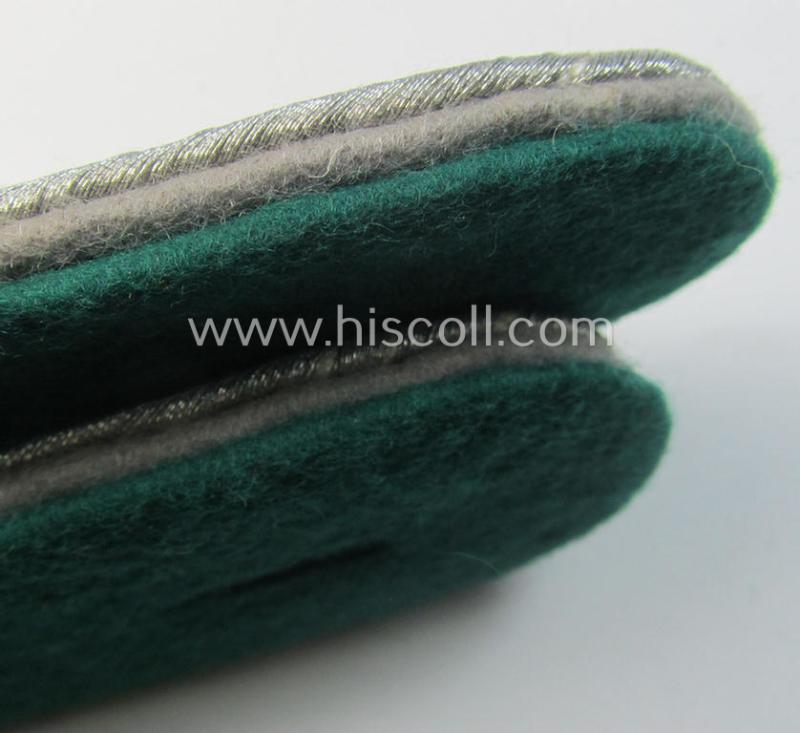 This is an attractive pair of WH (Luftwaffe) administrative-officers'-pattern shoulderboards (ie. 'Schulterstücke für Verwaltungs-Offiziere der Luftwaffe') having the darker-green- (ie. 'grüner'-) coloured branchcolour and having the (typical) dove-grey- (ie. 'grauer'-) coloured secondary branchcolour (ie. 'Zwischenfarbe') as was specifically intended for usage by a Luftwaffe-related: 'Oberleutnant des gehobener Dienstes' (or: air-forced-officer being of a rank comparable witin an: 'Oberleutnant'- ie. lieutnant first-class-rank) and that comes in an overall very nice- (I deem simply never worn- ie. 'virtually mint'-), condition. The boards - which have an approximate length of 11,5 cms. - are executed in the 'smooth'-like- and/or (typical) darker-green-coloured wool (aka moleskin'-wool) and have the have the dove-grey- (ie. 'grauer'-) coloured secondary branchcolour (ie. 'Zwischenfarbe') and typical silver-coloured (and shiny!) 'upperdecks' something that was obligatory for all shoulderboards as worn and/or used by the various 'Verwaltungs-Offiziere der Luftwaffe' holding this particular rank). The boards - which were worn on the 'standard'-type, bluish-grey-coloured 'Luftwaffe'-officers-pattern tunics - show a pair of (bright-golden-coloured- and/or 'Buntmetall'-based) pips, period-attached (as can be seen on the pictures). The pair never had any tongues and was most certainly intended as a pair of the 'sew-in'-pattern (as can be seen on the pictures). This interesting shoulderboard-pair originates from a larger shoulderboard- and/or insignia-collection I recently acquired for the web-site. Note: The German army had a tradition of maintaining a separate branch of 'Verwaltungs-Beamte' (ie. administrative-officials tasked to oversee all various administrative functions) who were responsible for a wide variety of administrative-tasks including court martial-, librarian-, supply-, technical- and meteorological-services, to schooing-, barracks- and/or: hospital-administration. Most 'officials-careers' consisted of four 'grades' being: 'high'-, 'elevated'-, 'medium'- and/or 'low'-grades with slightly differing identifying-insignia for each grade. The grade of the career was determined by the education and/or experience of the individual. Initially, all these 'Verwaltungs-Beamte' were identified by the darker-green-coloured branchcolour (ie. 'Waffenfarbe') having a secondary-branchcolour (ie. 'Neben- o. Zwischenfarbe') to indicate their actual career ie. function. There were various assorted 'Verwaltungs-Beamte' used the greyish-coloured branchcolour as the secondary-branch-colour making it virtually impossible to fully identify the function of the officer who wore these boards. Nevertheless, still an attractive pair of: 'Schulterstücke für Verwaltungs-Offiziere der Luftwaffe' that is (I deem) fairly priced!