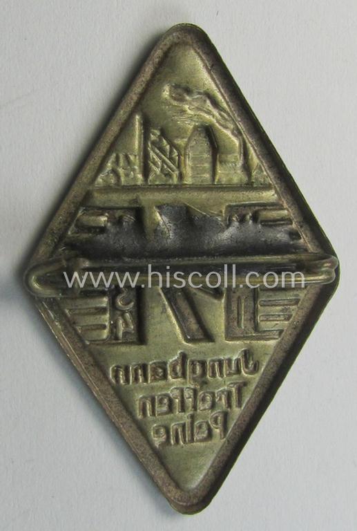 This is an attractive - and with certainty quite scarcely found! - so-called: HJ- ('Hitlerjugend') ie. specific DJ- ('Deutsches Jungvolk') related day-badge or 'tinnie' (ie. 'Tagungs- o. Veranstaltungsabzeichen') showing a towns-view, DJ-rune-sign and text that simply reads: 'Jungbann-Treffen - Peine - Mai 1934' and that comes in an overall very nice- (albeit issued- ie. I deem just moderately worn-), condition. The 'Raute'-shaped piece is executed from bright silver-toned- (ie. I deem 'Eisenblech'-based) metal and is (as more often) totally void of a makers'-designaton. The piece shows some normal wear and/or moderate age but has not been cleaned nor polished (it is still a bit dirty but has maintained a nice, minimally darkened- ie. tarnished, age-patina and holds all of its period-apllied finish). The medium-sized piece (having an approximate height of 4,2 cms.) comes naturally mounted onto its functional pin- ie. pin/catch set-up and shows some minimal age ie. staining (as can be seen on the pictures). It should be noted that all youth-related tinnies that were intended to commemorate an event at regional- (ie. 'towns'-) level (such as the piece on offer here) saw much more limited usage and can easily be graded 'scarce'. Simply a nice occasion to acquire an attractive - and truly unusally found! - HJ- ('Hitlerjugend') ie. specific DJ- ('Deutsches Jungvolk') related, so-called: 'Tagungs- o. Veranstaltungsabzeichen' for a justified price!