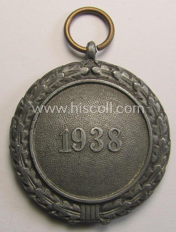 This is an attractive - and in such untouched condition fairly unusually seen! - example of a: 'Luftschutz-Ehrenzeichen 2. Stufe' (or: air-raid warden medal 2nd class) being a non-maker-marked- and/or regular-weight-version as was executed in (minimally tarnished) silverish-grey-toned, zinc-based metal (ie. 'Feinzink') and that comes stored in its original, carton- (ie. 'Zellstoff'-) based pouch as was produced by the maker: 'Katz u. Deyhle' and that comes in an overall very nice- (albeit I deem issued- albeit simply never worn nor even mounted-), condition. This example comes together with its original (minimally confectioned, folded and/or approximately 19 cms. long-sized-) ribbon as found and issued. The medal was most certainly issued but hardly worn (it shows some dust and dirt simply caused by years of storage only) but retains great pronounced detail without showing any defaults. The award comes mounted on its copper-based ring that is void of a makers'-designation. The pouch - which is scarcely seen in itself! - shows a printed makers'-mark on its back (that reads: 'Katz u. Deyhle - Pforzheim'). The pouch comes also in an overall nice - and of course fully functional - condition: it just shows some minimal staining and/or wrinkled appearance. I deem that the sets' comparative scarcity justifies my asking-price. It will be very difficult to upgrade this untouched set!