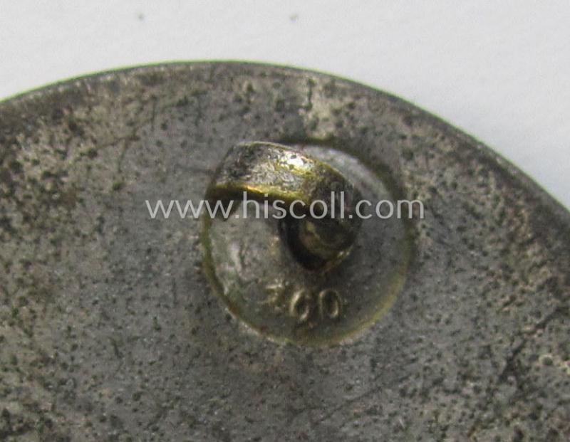 This is an attractive example of a silver-class wound-badge (or: 'Verwundeten-Abzeichen in Silber') being an example that is clearly maker-marked on the catch-set-up (as always with pieces by this maker) with the makers'-code: '100' (signifying that it is a piece as was produced by the 'Rudolf Wächtler & Lange' company) and that comes in an overall very nice- (albeit minimally used ie. worn-), condition. The badge - which is executed in nicely bright-silvered, zinc-based metal (ie. 'Feinzink') - shows some obvious wear ie. age and has a correct - and fully functional - pin- and/or (molded) catch (-set-up) in place. The badge has, however, never been cleaned and shows evident tarnish and/or wear: it truly retains most (ie. all) of its silverish finish. The badge - that was I deem never cleaned nor polished - is nicely maker-marked: '100' (on the round catch set-up as is common with these WBs) signifying that it is a piece as was produced by the 'Rudolf Wächtler u. Lange' company, based in Mittwaida. Simply an attractive and clearly maker-marked silver WB that is accordingly priced!