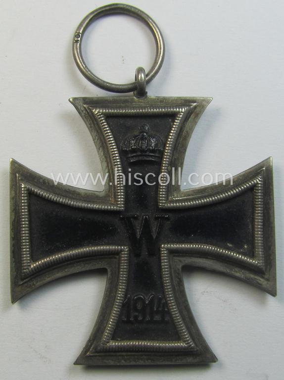 This is an attractive example of an (I deem) surely issued- but hardly worn example of a WWI-period: 'Eisernes Kreuz II. Klasse' (or: iron cross second class) and that comes as issued and/or recently found. The detail on this example is nicely preserved: it has - I deem - never been cleaned nor polished and has an attractive and/or minimally tarnished age-patina (as can be seen on the pictures). The cross came together with its folded (shortened and/or confectioned) ribbon (ie. 'Bandabschnitt'). The IC truly retains nice details and shows a makers'-designation that reads: 'KO'- (as can be seen on the pictures). The award - that might well be a by the: company: 'Klein & Quenzer'-produced cross - has a nicely preserved, black-finished (ie. somewhat 'satin-like'- ie. 'shiny-style'-) core and is void of any real damage or paint-loss and has been truly nicely preserved. The piece is just a tiny bit dusty and/or stained but was never cleaned nor polished (as can be seen on the pictures). The ribbon (approx. 16 cms. sized) shows only minimal usage and/or staining. Simply a neat WWI-period 'EKII. Klasse' that is with certainty accordingly priced!