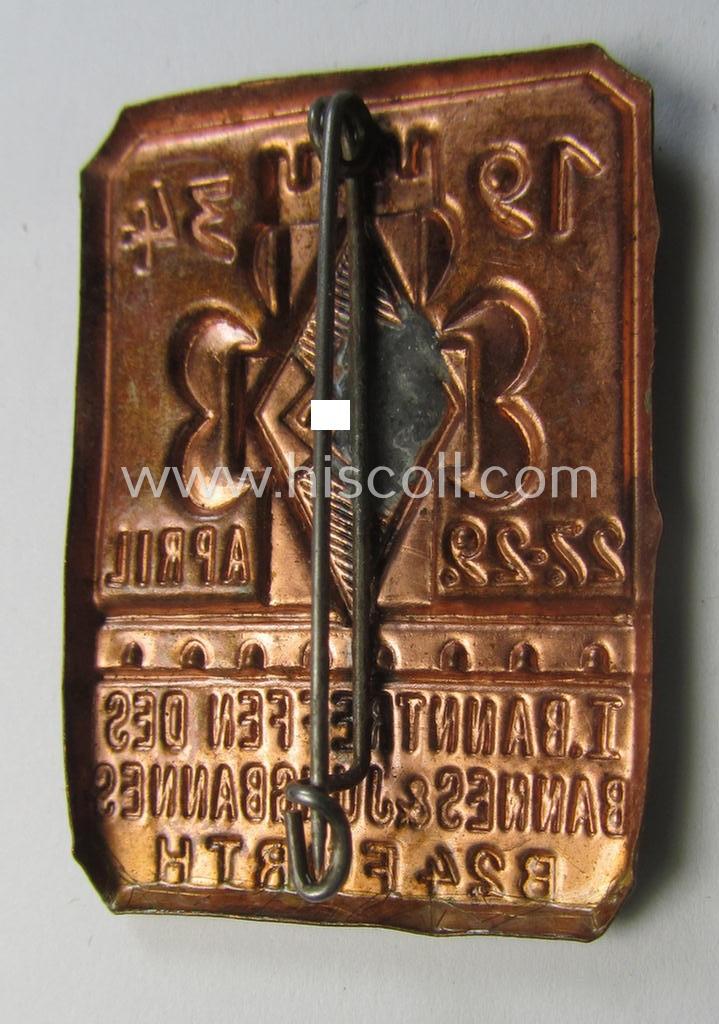 Attractive - and actually scarcely encountered! - reddish-bronze-toned HJ ('Hitlerjugend') related 'tinnie' being a non-maker-marked example showing the text: 'I. Banntreffen des Bannes & Jungbannes B24 - Fürth - 27.-29. April 1934'