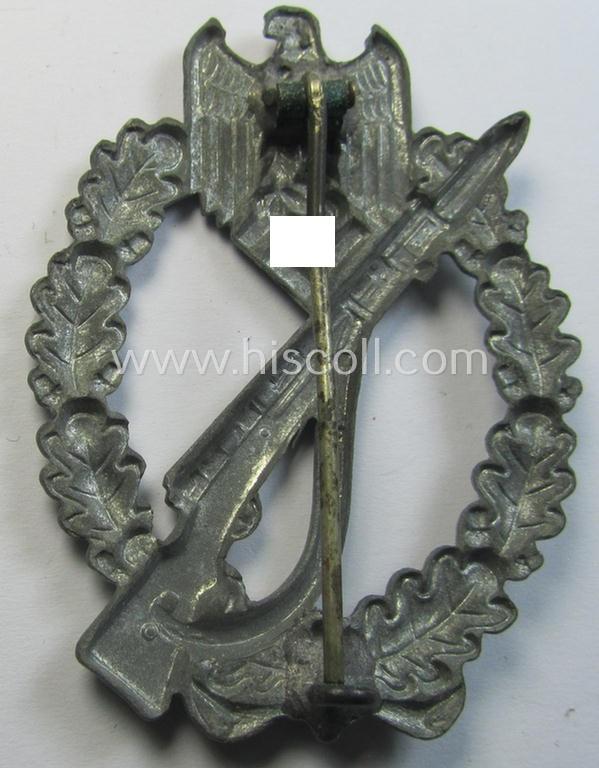 Attractive, 'Infanterie Sturmabzeichen in Silber', being an unmarked (and/or converse- ie. vaulted-) 'hollow-back' example by the maker: 'Friedrich Linden' (ie. 'F.L.L.') as executed in greyish-silver-coloured, zinc-based metal (ie. 'Feinzink')