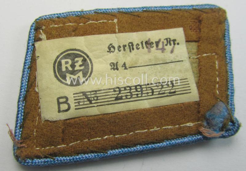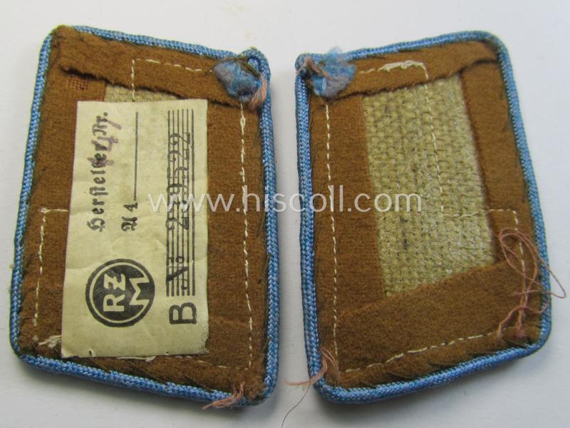 This is an attractive - fully matching and actually scarcely encountered! - pair of N.S.D.A.P.-type, smooth-woolen-based collar-patches (ie. 'Kragenspiegelsatz für politischen Leiter') being of the second pattern as was used from 1934 upto 1939 as was specifically intended for usage by an: 'N.S.D.A.P.-Hauptstellenleiter' at 'Orts'-level and that comes in an overall very nice- (ie. I deem just moderately used and/or carefully tunic-removed-), condition. The neat pieces - which are constructed from the golden-brown-coloured- and/or typical 'smooth-type'- (ie. moleskin-type-) wool - come in a nice condition overall: they both have the neat, double silver-coloured (and L-shaped) swastika-braid attached. The tabs are piped with light-blue coloured- and rayon-based piping (as always) signifying that the pair was intended for a party-official serving at: 'Orts'-level. One of the tabs still shows its paper-based 'RzM'-etiket as issued (as can be noticed on the pictures). The set was most certainly never worn and originates from a fairly large cloth-insignia lot that originated from an older collection in the USA. The set shows some (truly non-disturbing) tarnish and/or aging caused by having been stored as such for decades (as can be noticed on the pictures). In any case is this a neat and fairly unusually encountered N.S.D.A.P.-collar-tab-set that is not that often offered for sale.