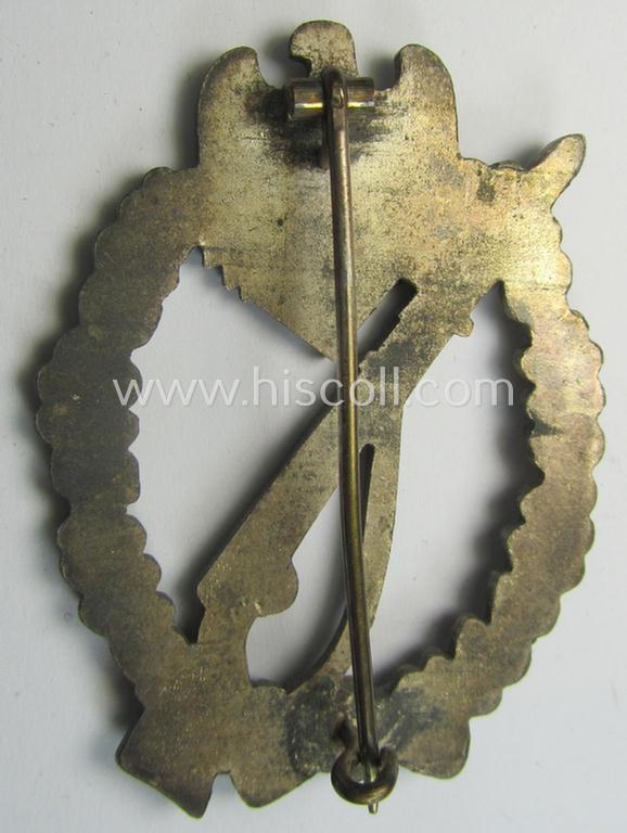 This is an attractive - albeit most certainly issued- and/or just moderately worn - example of an: 'Infanterie Sturmabzeichen in Silber' (or: silver-class infantry-assault-badge ie. IAB) being a non-maker-marked, so-called: 'solid-back'- and/or greyish-silvered, zinc- (ie. 'Feinzink'-) based specimen as was - I deem - produced by the: 'Paul Meybauer'-company and that comes in an overall nice- (and I deem surely issued and/or just moderately used ie. worn-), condition. This example is a non-maker-marked award and shows the various characteristics as only seen on IABs as produced by the: 'Meybauer'-company. The - very pronounced! - war-badge seems to be totally uncleaned and has a still a very attractive and somewhat tarnished age-patina: truly most of its period-applied finish has been nicely preserved (as can be seen on the pictures). The pin and/or catch (ie. set-up-) are of course fully functional and present. The piece - which originates from a private-household where it was recently found - was never cleaned and has been nicely preserved. Simply an honest 'Feinzink'-based, silver-class IAB as was produced the desirable maker (ie. 'Hersteller') 'Paul Meybauer' and that is accordingly priced!