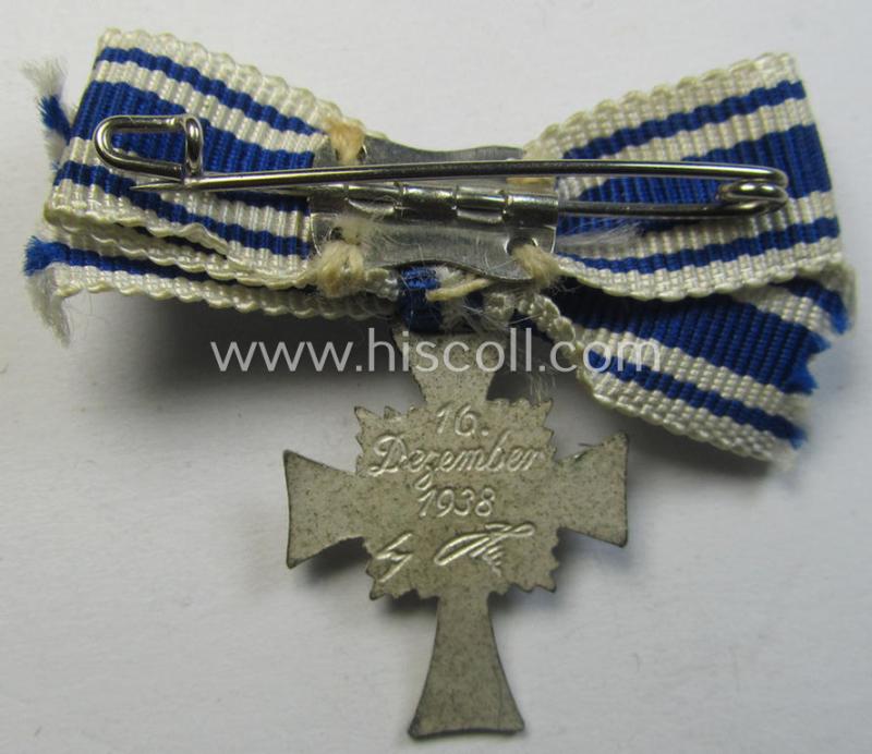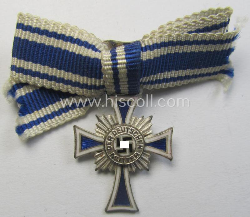 This is an attractive - and with certainty desirable! - albeit non-maker-marked- (and only 2 cms.-sized!) miniature of an: 'Ehrenkreuz der Deutschen Mutter in Silber' (or: miniature silver-class mothers'-cross) that came stored in its neat (typical) bordeaux-red-coloured- and/or equally non-maker-marked, two-pieced 'LDO'-type box (ie. etui) and that comes in an overall nice- (albeit I deem issued ie. minimally used- ie. worn-), condition. The small-sized award has truly no enamel damage whatsoever and comes in a very nice condition overall: it shows the to be expected motto on its back which reads: '16 December 1938 - Adolf Hitler' but is void of a makers'-designation (as more often). The silver-toned finish is just a tiny bit tarnished, but the piece was I deem never cleaned nor polished. The small badge (only: 2 cms. high!) shows great, pronounced detail: just like its larger 'regular'-sized counterparts. The miniature comes mounted onto its original safety-pin-attachment, fitted for easy attaching it to a dress (or even uniform). The miniature came stored in its neat bordeaux-red-coloured- and typical 2-pieced 'LDO'-type box (ie. etui) as found. This tiny box (only sized 4 x 4 cms.) shows a (black-toned) 'LDO'-designation printed into its top-lid. The etui shows a minimally 'dented' (and somewhat 'cracked') bottom-section that is, however, still firm and in place (as can be noticed on the pictures). Simply a great occasion to acquire a complete: 'Ehrenkreuz der Deutschen Mutter in Silber'-miniature that came stored in its period 'LDO'-type box (ie. etui)!