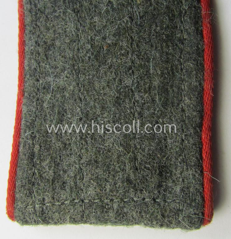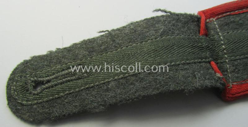 The neat WH (Heeres) 'Artillerie' shoulderstrap - which is piped in the neat bright-red- (ie. 'hochroter'-) coloured branchcolour - measures approximately 11 cms. in length and has the neat bright-red- (ie. 'hochroter'-) coloured- (and/or: 'silk-like'-type-) piping attached (as is more often encountered with these later-war-period straps). The strap is constructed following the typical '1944 cloth-minimising production-manner' using different shades of wool and/or material. It comes naturally mounted onto its functional tongue. It should be noted that all 'M44'-style, EM-type straps are actually quite hard to encounter and can easily be graded 'scarce'.