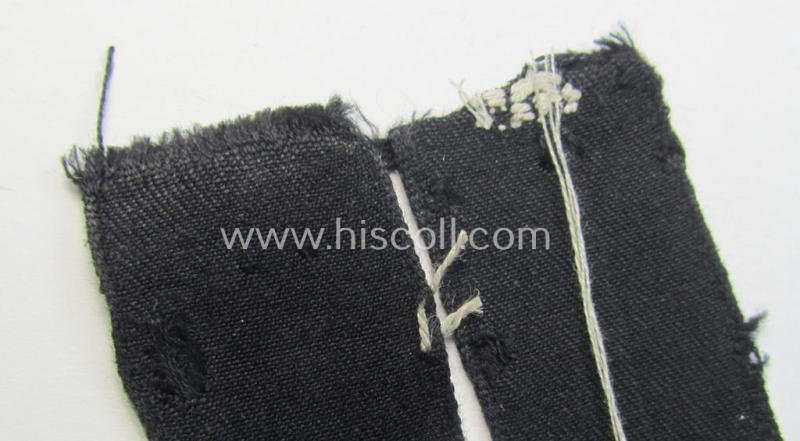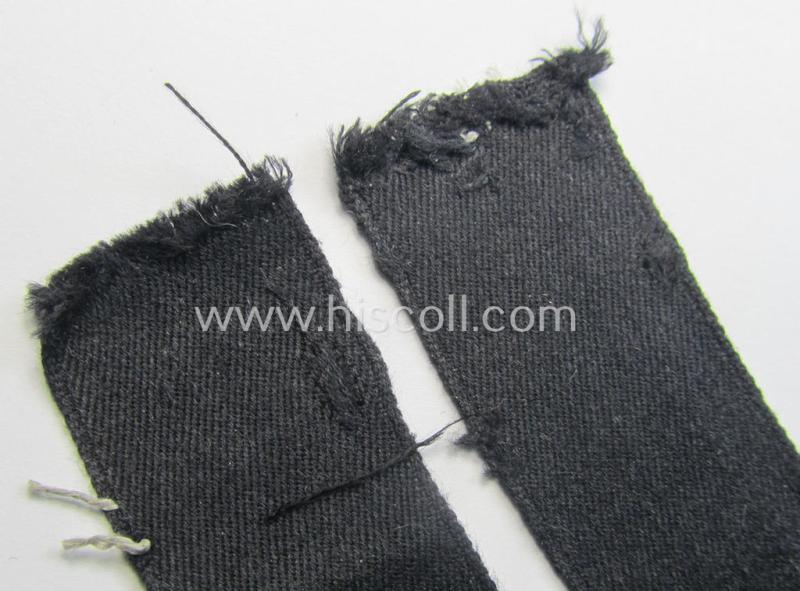 This is an attractive - and truly worn! - RAD (ie. 'Reichsarbeitsdienst') enlisted-mens'- (ie. NCO-) pattern, commemorative cuff-title (ie. 'Dienstärmelstreifen für Mannschaften u. Unteroffiziere') depicting a capital 'S'-character (as was presumably intended for staff working on the various 'Westwall'-fortifications in the Saarland-region) and that comes in an overall nice- (albeit moderately used- and/or clearly tunic-removed-), condition. These RAD-cuff-titles (or in German language known as: 'Dienstärmelstreifen') were worn on the lower left sleeve of the mustard-brown-coloured RAD-tunics. The cuff-title is neatly executed in white-coloured braid in so-called: 'BeVo'-weave-technique and was intended for RAD staff-members that were (most likely) employed in various 'Westwall'-fortifications in the Saarland-region. There is, however, an on-going discussion on the exact usage and signifigance of these RAD commemorative-cuff-titles (which were I deem introduced by an order dated March 1939). The band is void of a makers'-designation (just the remains are visible as can be seen on the pictures). This example - which comes in a somewhat shortened condition and that was clearly tunic-removed - measures 34 cms. in length and originates from a small collection of RAD cloth-insignia I recently acquired. This particular example was clearly worn (some minimal stitching-marks ie. remains are still visible) but comes in an overall nice condition. Simply an attractive piece of RAD-insignia that is accordingly priced!