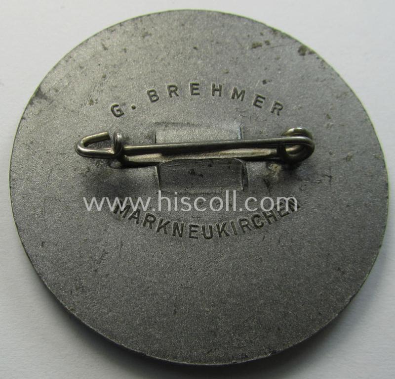 This is a neat - and actually nicely executed! - so-called: N.S.D.A.P.-related 'tinnie' (ie. 'Tagungs- o. Veranstaltungsabzeichen') being a neatly-maker- (ie. G. Brehmer - Markneukirchen'-) marked example showing the text: 'Reichsparteitag 1937' and that comes in an overall nice- (I deem issued-, moderately worn- but somewhat stained-), condition. The piece is executed in (greyish) silver-coloured metal (I deem typical zinc): it shows some obvious (handling) age but has never been cleaned nor polished (it is still a bit dirty but has maintained a nice, somewhat tarnished, age-patina). The 'tinnie' comes mounted onto its functional pin-/catch set-up and shows some minimal age ie. staining (as can be seen on the pictures). The piece shows a 'Reichsadler'- and/or swastika-sign and illustration of three men holding a statue coupled with the text: 'Reichsparteitag 1937'. Simply a nice occasion to acquire an N.S.D.A.P.-related, so-called: 'Tagungs- o. Veranstaltungsabzeichen' for an interesting price!