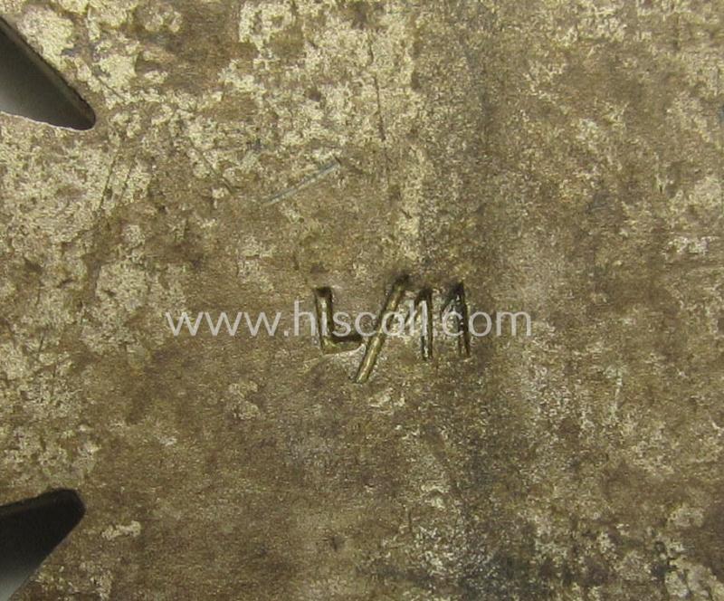 The attractive 'Kriegsverdienstkreuz 1. Klasse mit Schwertern' on offer here is a truly attractive and neatly maker- (ie. 'L/11'- thus by the company 'Wilh. Deumer - Lüdenscheid'-) marked, so-called: 'Buntmetall'- ie. 'Tombak-'based specimen that was just moderately used and/or worn: it came still stored in its original (and truly fairly luxuriously-styled!) black-coloured etui as produced, issued and/or stored for decades. The attractive - and I deem typical early-war-period - specimen is executed in bright-silver-coloured- and/or: 'Buntmetall'-based metal and comes in an overall nice- (albeit moderately worn- and used-), condition. The naturally non-magnetic- and/or non-vaulted cross shows a somewhat tarnished age-patina but has not recently been cleaned or polished: it still retains most of its 'frosted' silverish-coloured finish and retains a fair bit of its high-polished sides (ie. 'hochpolierte Kanten') as can be seen on the pictures. The cross comes naturally mounted onto its functional (straight-shaped- ie. flattened) pin- and/or: period catch (ie. catch-set-up) which are both present and unaltered (as can be seen on the pictures). The piece - which shows the makers'-designation 'L/11' stamped onto its back - is a typical, quality-produced specimen by the desirable maker: 'Wilhelm Deumer' as was based in the town of Lüdenscheid that comes as found and/or stored for decades. The etui comes in an equally nicely preserved condition: it is fully functional (and shows the printed, very detailed and/or silverish-grey-coloured 'KvK'-symbol on its top). The etui has a fully preserved, black-coloured- (ie. velvet-based-) interior-section (as can be seen on the pictures). Simply a nice occasion to acquire an attractive and fully complete: 'Kriegsverdienstkreuz 1. Klasse mit Schwerter'-set for a justified price!