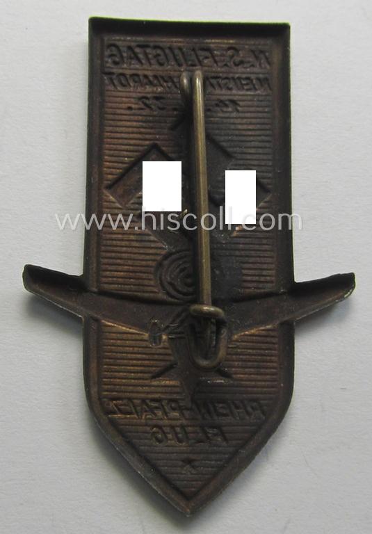 Commemorative, hollow-back- and/or bronze-toned, so-called: 'Flieger'-related day-badge (ie. 'tinnie') being a non-maker-marked example showing the text: 'N.S. Flugtag - Neustadt-Haardt - 14.8.1932 - Rhein-Pfalz Flug'
