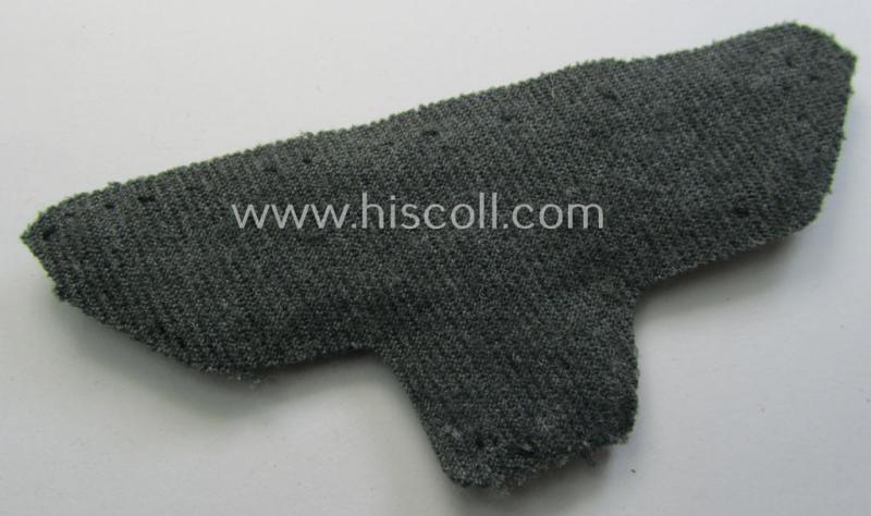 This is a neat - and actually unusually seen! - and I deem moderately worn example of a WH (Heeres) officers'-type, hand-embroidered breast-eagle (ie. 'Brustadler für Offiziere') as was executed in bright-silverish-coloured braid as was intended for usage on the various officers'-pattern tunics and that comes still (hand-sewn!) onto a piece of a: Heeres officers'-tunic-cloth and that comes in a moderately used- and/or carefully 'clearly cut-out of a tunic', condition (as can be noticed on the pictures). The (unique) piece originated from the USA where it was stored for decades a so-called: 'veteran bring-back'. Simply an attractive - and truly unusually found! - WH (Heeres) officers'-type breast-eagle ie. 'cut-out-piece' that is I deem accordingly priced!