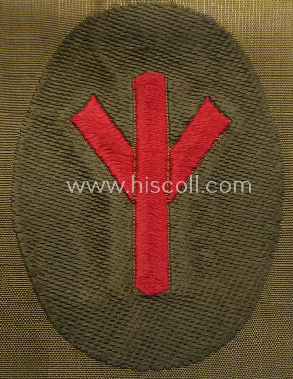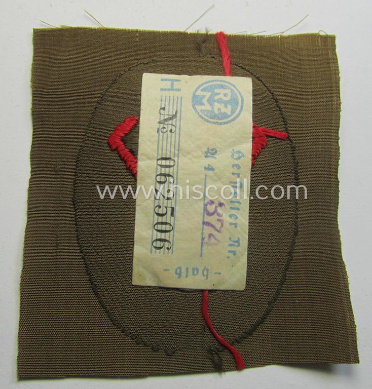 This is an attractive - and actually not that commonly encountered! - SA (ie. 'Sturmabteilungen') armbadge as executed in neat 'BeVo'-weave pattern, as was specifically intended for usage by a: 'Sanitäts-Unterführer o. Mann' (ie. 'SA-Feldscher' or: medical-orderly) and that comes in an overall very nice- (ie. simply never used- nor tunic- ie. shirt-attached-), condition. This nicely woven arm-badge is sized: 7 x 5 cms. (and is executed in bright-red-coloured linnen on a - typical SA-coloured - brownish-coloured and/or also linnen-based background). The piece was simply never folded nor trimmed and still retains its so-called: 'RzM'-etiket (as can be seen on the pictures). It just shows some minimal age ie. staining caused by decades of storage only. Simply a neat - and actually not that commonly encountered! - 'BeVo'-type, SA-related arm-patch that belonged to an: 'Sanitäts-Unterführer o. Mann' (ie. 'SA-Feldscher')!