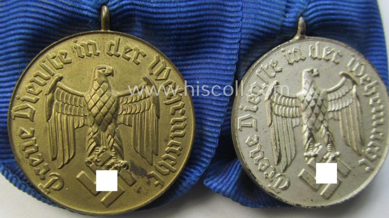 Attractive - and minimally used! - two-pieced medal-bar (ie. 'Spange') showing two: WH (Heeres o. Kriegsmarine) so-called: 'Dienstauszeichnungen für 4 u. 12 Jahre Treue Dienste' that both come period-mounted as a so-called: 'Doppelspange'