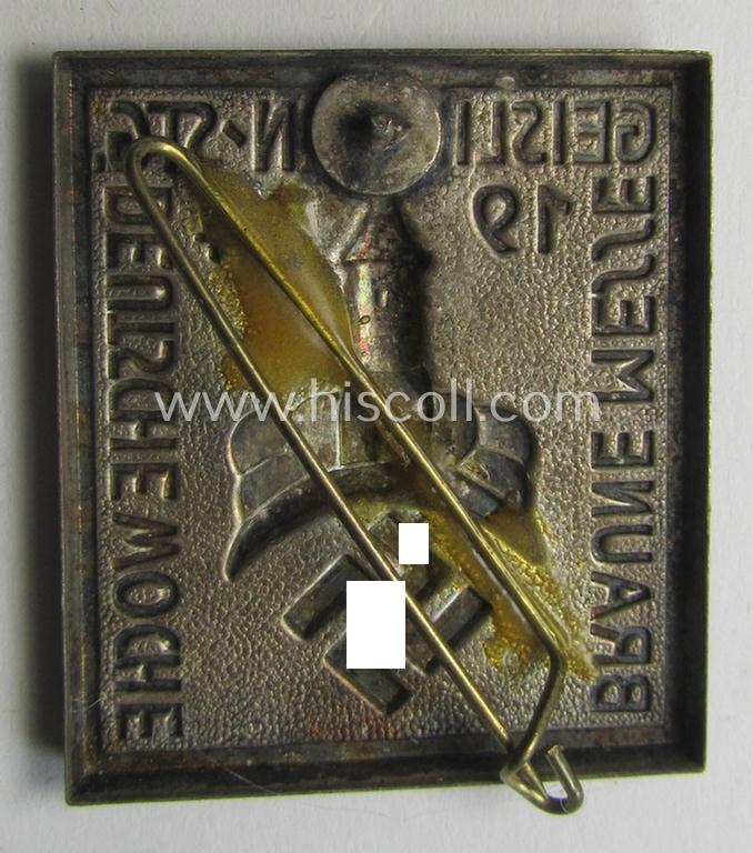 Early-period, silver-coloured- and/or 'Buntmetall'-based, N.S.D.A.P.-related day-badge (ie. 'tinnie' or: 'Veranstaltungsabzeichen') being a commemorative example that is entitled: 'Braune Messe - Deutsche Woche - Geislingen-Stg. - 1934'
