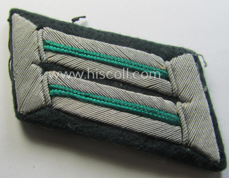 Fully matching - and moderately worn! - pair of WH (Heeres) collar-tabs (ie. 'Kragenspiegel für Offiziere') as piped in the desirable green- (ie. 'grüner'-) coloured branchcolour as was intended for an: 'Offizier eines Jäger- o. Gebirgsjäger-Rgts.'