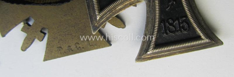 This is an attractive - and just moderately used- and/or worn - three-pieced 'WWI'- and/or: Third Reich-period-related medal-bar (ie. 'Ordenspange') respectively depicting a WWI-period: 'Eisernes Kreuz II. Klasse' (or: iron cross second class), a: 'Frontkämpferkreuz 1914-18' (ie.: 'Kriegsteilnehmerkreuz mit Schwertern') and a neatly bright-silver-toned: Treuedienst Ehrenzeichen 2. Klasse' (or: silver-class, loyal-service-medal for 25 yrs. of loyal civil-service) all three awards coming in an overall very nice- (and I deem only moderately used- and/or worn-), condition. All three awards are truly nicely preserved examples that seem to have never been cleaned nor polished: they come in an equally minimally tarnished- ie. dusty (ie. used) condition and come naturally mounted onto their period ribbons. The detail on the 'EKII. Klasse' is truly stunning and nicely preserved: it has - I deem - never been cleaned nor polished and has an attractive and/or minimally tarnished age-patina (as can be seen on the pictures). It retains nice details and has a nicely preserved, black-finished (ie. somewhat 'satin-like'- ie. 'shiny-style') core and is void of any damage nor paint-loss. The FKK 1914-18 shows a clear makers'-designation on its back (that reads: 'P. & C. - L..' as can be noticed on the pictures). The detail on this award is also nicely preserved but it does show some tarnished age-patina and some minimal staining (as can be seen on the pictures). The 'Treuedienst Ehrenzeichen 2. Klasse' is a very nicely preserved example that shows an undamaged enamelled swastika-area and truly retains all of its period-finish (as can be noticed on the pictures). All three awards - which show their nicely preserved, period ribbons - come both 'period-mounted' onto a metal-based 'clasp' that is neatly backed with a piece of field-grey-coloured wool (and that shows a functional pin- ie. catch-set-up) as was intended for wearing this example on a 'going-out'- ie. dress-tunic or 'Waffenrock'. Simply an attractive example of a three-pieced WWI-period- (ie. Third Reich-) related 'Ordenspange' that is (I deem) accordingly priced!