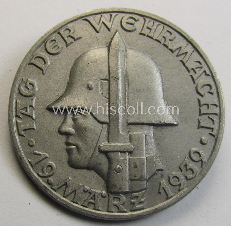 Silver-toned, W.H.W.- (ie. 'Winterhilfswerke'-) related day-badge (ie. 'tinnie') being a non-maker-marked example as was issued to commemorate the: 'WHW'-gathering ie. rally entitled: 'Tag der Wehrmacht - 19 März 1939'