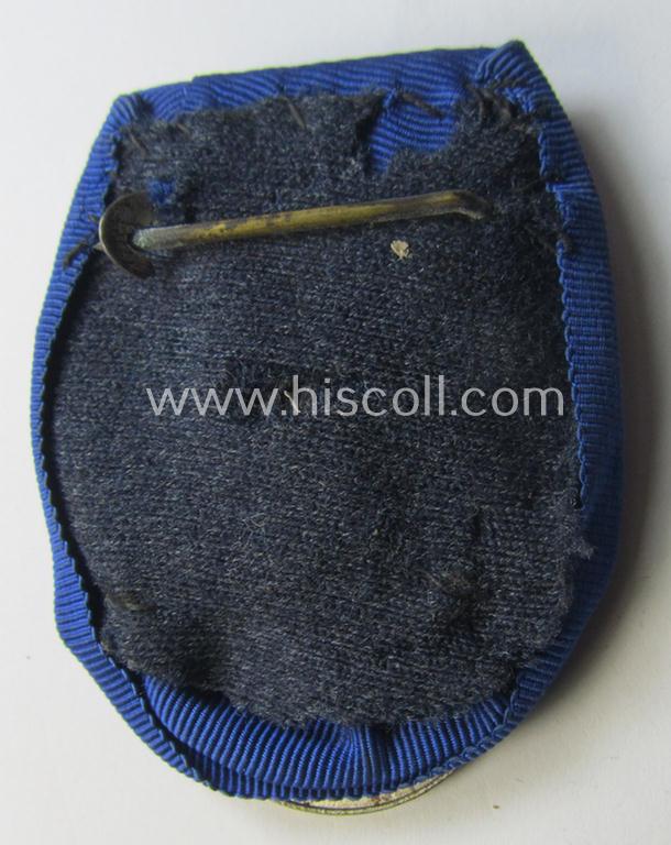 This is a neat - and I deem clearly used- and/or worn! - example of a tarnished ie. stained, (bright) silver-toned WH (Heeres o. Kriegsmarine) so-called: 'Einzelspange' (or: single-pieced medal-bar) showing a detailed: 'WH-Dienstauszeichnung 4. Stufe' (as was intended for 4 years of loyal-service) and that has a neat and pronounced (regular-sized) WH (Heeres o. Kriegsmarine) eagle-device period-attached and that comes mounted onto its confectioned, darker-blue- (ie. cornflower-blue-) coloured ribbon as issued and/or worn. The detail on this example is still neat and pronounced: it has - I deem - never been cleaned nor polished and has an attractive and as stated above tarnished- ie. rust-stained) age-patina. The medal comes 'mounted' onto a metal-based clasp that is 'backed' with a piece of greyish-coloured wool (and having a functional pin/catch-set-up) as was intended for wearing this example on a 'going-out'- ie. dress-tunic or 'Waffenrock'. The blue-coloured ribbon shows only minimal usage and/or staining. Simply a neat WH (Heeres o. Kriegsmarine) example that comes mounted as an: 'Einzelspange' and that is (I deem) priced according to its stained condition!