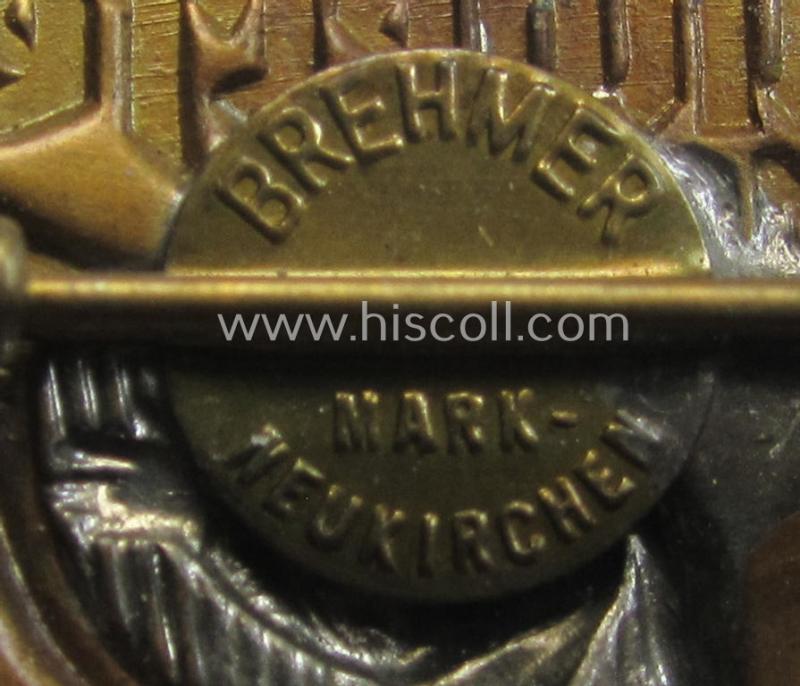 The neat and commemorative, so-called: 'DSB'- (ie. 'Deutsche Sänger Bund'-) related day-badge (ie. 'tinnie' or: 'Veranstaltungsabzeichen') is executed in (minimally tarnished) golden-bronze-toned (and I deem) zinc-based (pot)metal and depicts an illustration of a male singer, the typical 'DSB'-logo (ie. 'Raute') with swastika, towns-view and/or text that simply reads: 'Sängerfest Gau 19 - Gera - Thüringen - 22.-23. Juni 1935' and that was as such intended- ie. issued for a: two-day-lasting 'DSB'- (ie. 'Deutsche Sänger Bund'-) related gathering, held in the year 1935. The badge - that shows some normal wear and/or moderate age - shows a clearly-present makers'-designation (on its pin-set-up) that reads: 'Brehmer - Markneukirchen' and comes naturally mounted onto its (functional) pin- ie. pin/catch set-up. It has I deem never been cleaned nor polished and shows some minimal age ie. staining (as can be seen on the pictures) but is still very detailed and/or pronounced (as can be seen on the pictures). I am convinced that this is an unusally encountered (locally issued!) 'DSB'- (ie. 'Deutsche Sänger Bund'-) related 'tinnie' that is with certainty accordingly priced!
