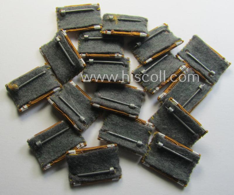 I recently found a limited quantity of TR-period so-called: 'Feld-/Bandspangen' (ie. single-pieced ribbon-bars) that originated from the left-overs of an old tailor-shop and that all come in an overall very nice- (ie. simply never worn- ie. 'virtually mint- and/or unissued'-), condition. The items offered here are the 'standard' (ie. regular-shaped!) one-pieced ribbon-bars (ie.: 'Feld- o. Bandspangen') as were intended for the: 'Deutsches Schutzwall Ehrenzeichen' (aka: 'Westwall'-medal). The pieces are of the regular- (ie. 2,5 cms. wide-sized-) version and are all neatly 'backed' with a piece of typical field-grey-coloured- and/or woolen-based material (as can be seen on the pictures). The bars come in a very nice condition and are naturally fully functional. I can offer them for an atractive and competitve price (they are of course priced per single piece!). Please do note that this item does not show 'reserved' before the last item has been sold. Simple a neat medal-accesory that is I deem accordingly priced!