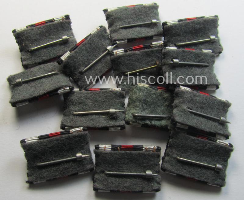 I recently found a limited quantity of 'WWI-period'- (ie. TR-period related!) so-called: 'Feld-/Bandspangen' (ie. single-pieced ribbon-bars) that originated from the left-overs of an old tailor-shop and that all come in an overall very nice- (ie. simply never worn- ie. 'virtually mint- and/or unissued'-), condition. The items offered here are the 'standard' (ie. regular-shaped!) one-pieced ribbon-bars (ie.: 'Feld- o. Bandspangen') as were intended for the: 'Frontkämpferkreuz 1914-18' (ie.: 'Kriegsteilnehmerkreuz mit Schwertern'). The pieces are of the regular- (ie. 2,5 cms. wide-sized-) version and are all neatly 'backed' with a piece of typical field-grey-coloured- and/or woolen-based materia: moreover, do they all show a golden-bronze-toned crossed-swords device attached (as can be seen on the pictures). The bars come in a very nice condition and are naturally fully functional. I can offer them for an atractive and competitve price (they are of course priced per single piece!). Please do note that this item does not show 'reserved' before the last item has been sold. Simple a neat medal-accesory that is I deem accordingly priced!