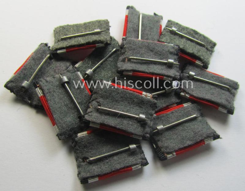 I recently found a limited quantity of WWII- (ie. TR-) period so-called: 'Feld-/Bandspangen' (ie. single-pieced ribbon-bars) that originated from the left-overs of an old tailor-shop and that all come in an overall very nice- (ie. simply never worn- ie. 'virtually mint- and/or unissued'-), condition. The items offered here are the 'standard' (ie. regular-shaped!) one-pieced ribbon-bars (ie.: 'Feld- o. Bandspangen') as were intended for the: 'Eisernes Kreuz II. Klasse' (or: iron cross second class). The pieces are of the regular- (ie. 2,5 cms. wide-sized-) version and are all neatly 'backed' with a piece of typical field-grey-coloured- and/or woolen-based material (as can be seen on the pictures). The bars come in a very nice condition and are naturally fully functional. I can offer them for an atractive and competitve price (they are of course priced per single piece!). Please do note that this item does not show 'reserved' before the last item has been sold. Simple a neat medal-accesory that is I deem accordingly priced!
