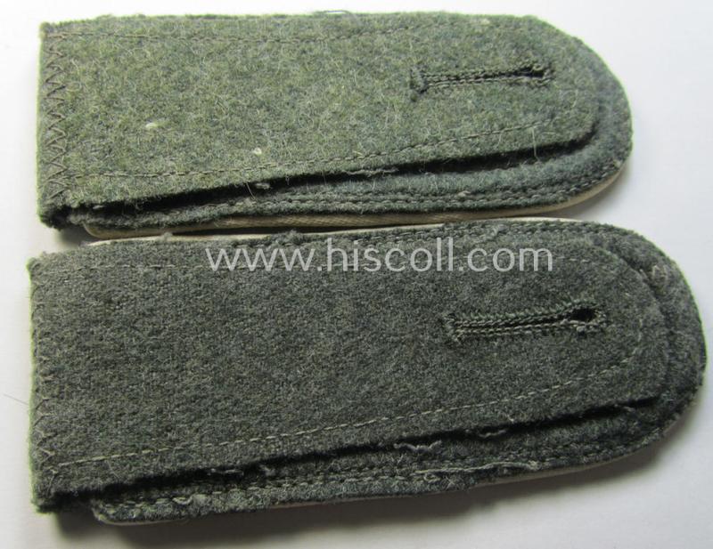 This is a truly very attractive - and/or fully matching! - pair of 'standard-issue'-pattern, WH (Heeres) early- (ie. mid-) war-period- (ie. 'M40- o. M43'-) pattern NCO-type shoulderstraps (ie. 'Schulterklappen für Unteroffiziere des Heeres') as piped in the white- (ie. 'weisser'-) coloured branchcolour as was intended for - and clearly worn by! - an: 'Unteroffizier eines Infanterie-Regiments' (or: NCO ie. junior-sergeant who served within an infantry-regiment ie. unit) and that comes in an overall very nice- (ie. clearly used- ie. worn- and/or tunic-removed-), condition. The straps - which are both approximately 11 cms. sized in length - have the 'standard-pattern'- and/or: field-grey-coloured, woolen-based 'upperdecks' and have as stated above the desirable 'silk-like'-type- and/or white- (ie. 'weisser'-) coloured branchcolour ie. piping attached (as can be seen on the pictures). The shoulderstraps show the ('standard'-issue-pattern) bluish-grey-coloured (and neatly 'sub-dued'!) NCO-braid attached denoting that the pair was intended for an NCO holding the rank of: 'Unteroffizier'. The pair - that shows some obvious albeit minimal wear - comes mounted onto its original tongues and does just show some moderate age and/or staining (as can be seen on the pictures). Simply a very attractive early- (ie. mid-) war-period, 'Heeres' NCO-type, 'Infanterie'-related shoulderstrap-pair that belonged to an: 'Unteroffizier eines Infanterie-Regiments': I deem that I have priced this very attractive - and by all means 'text-book'! - pair accordingly!