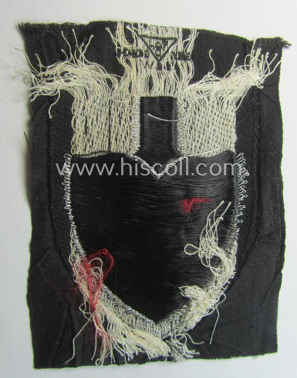 This is a very attractive - and actually very scarcely encountered! - officers'-type version of a so-called: RAD (ie. 'Reichsarbeitsdienst') sleeve-badge (or: 'Dienststellen-Abzeichen') bearing the specialist-designation: 'M' (as was intended for a senior RAD-official with the truly not that often seen function of: 'Hauptmeldebeamter' (or: senior-communications-official) and that comes in an overall nice- (ie. I deem clearly used- and/or once tunic-attached-), condition. These badges were worn on the upper-left sleeve of the mustard-coloured (officers'-type-) RAD-tunics and/or garments. The badge - which shows the red-coloured 'M'-character - is neatly executed in so-called 'flat-wire'-like-'BeVo'-weave technique. The piece was (once) neatly folded but not trimmed as to be expected (and still shows some of its period stitching- ie. thread-remains with which it was once tunic-attached). The badge is neatly maker-marked and displays the interwoven so-called: 'Ges.Gesch.'-designation as is more often found on RAD cloth badges- and/or insignia. This badge originates from a smaller collection of rarely seen RAD cloth-insignia I recently acquired for the web-site. It should be noted that all RAD officers'-type badges are comparatively scarcely encountered: those intended for specialised functions even more so!